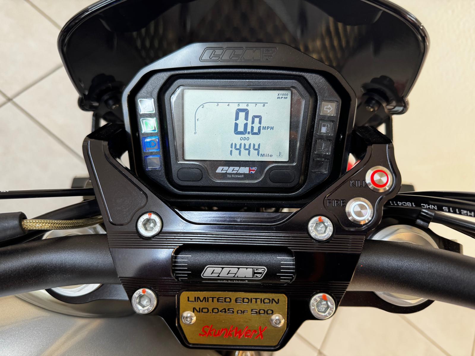 SPEC INCLUDES : Stage 1 Re-Map, Monza Fuel Cap, Fly Screen, Crankcase Badges, Bar End Mirrors, Stainless Radiator Guard, Side Mount Number Plate, Carbon Chain Guard, Carbon Rear Master Cylinder Cover, Billet Adjustable Brake And Clutch Levers, Billet Clutch Cylinder Cover, Billet Swingarm Torque Block, Billet Brake And Clutch Caps, Billet Sproket Cover, Billet Oil Filler Cap, Genuine CCM Indoor Bike Cover, Underseat Indicators.