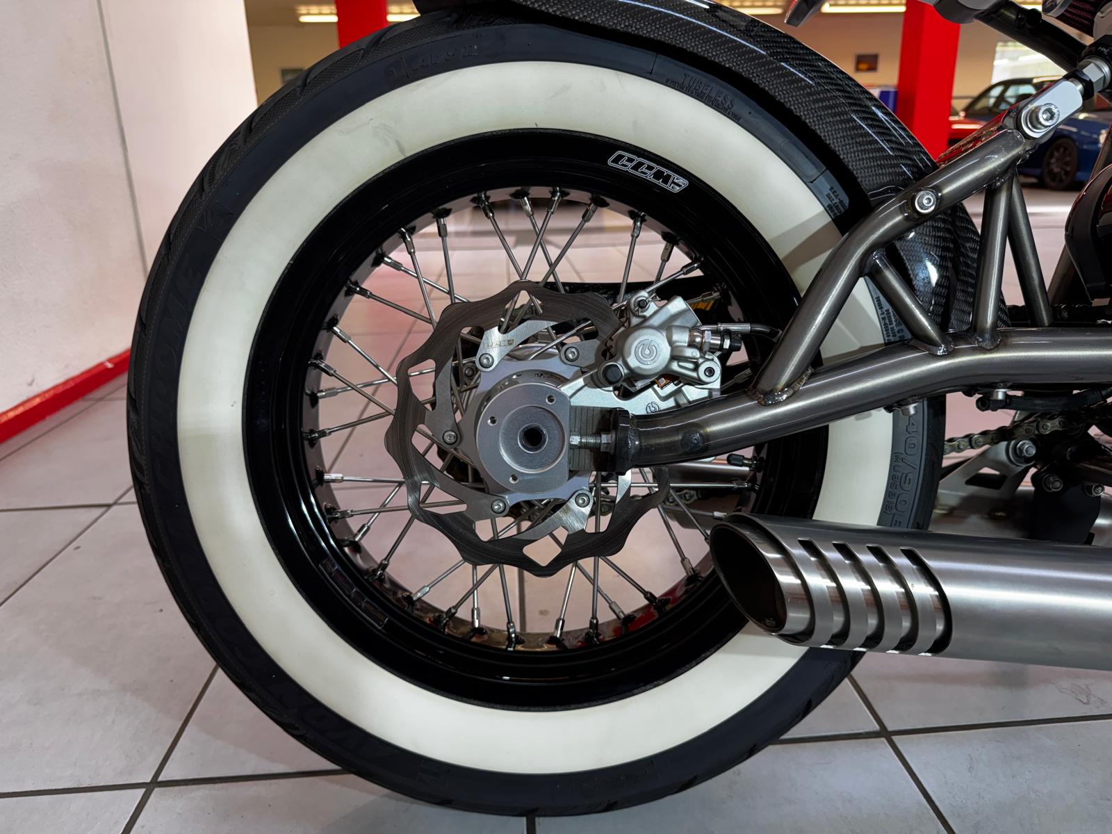 SPEC INCLUDES : Diamond Cut Cylinder Heads, Ultima R1 Carburetor, Supertrapp Exhaust System, Single Down Fat Tube Design Frame, USA Chrome Inverted Forks, Adjustable Rear Air Suspension,Tear Drop Petrol Tank With Hidden Filler Cap, Harrison 6 Pot Front Billet Brakes, Harrison 4 Pot Rear Billet Brakes, Custom Made Fat Bars To accept All Internal Wiring Brake Lines Cables Etc, Climax Control With Built In Master Cylinders For Brakes And Clutch.